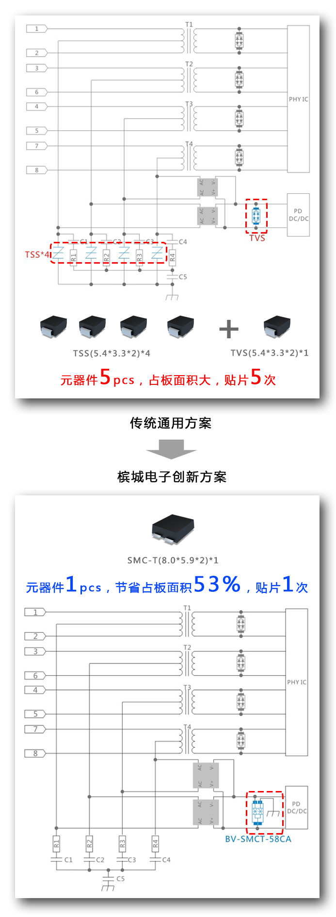 該優(yōu)化方案適用于所有有POE浪涌防護需求的設(shè)備,防護等級對應(yīng)方案向下兼容。方案具有使用簡單,殘壓低,占板空間小、高性價比等特點。單顆集成的BV-SMCT-58CA功率大,余量足且體積非常小,響應(yīng)速度快,大大提升防護效率。